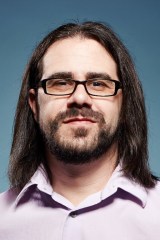 Photo of author Jeff Bogle, sitting with his cat in his lap by a tree. Jeff and the cat are facing the camera, angled down. Jeff is smiling. The cat’s eyes are closed; it looks content.